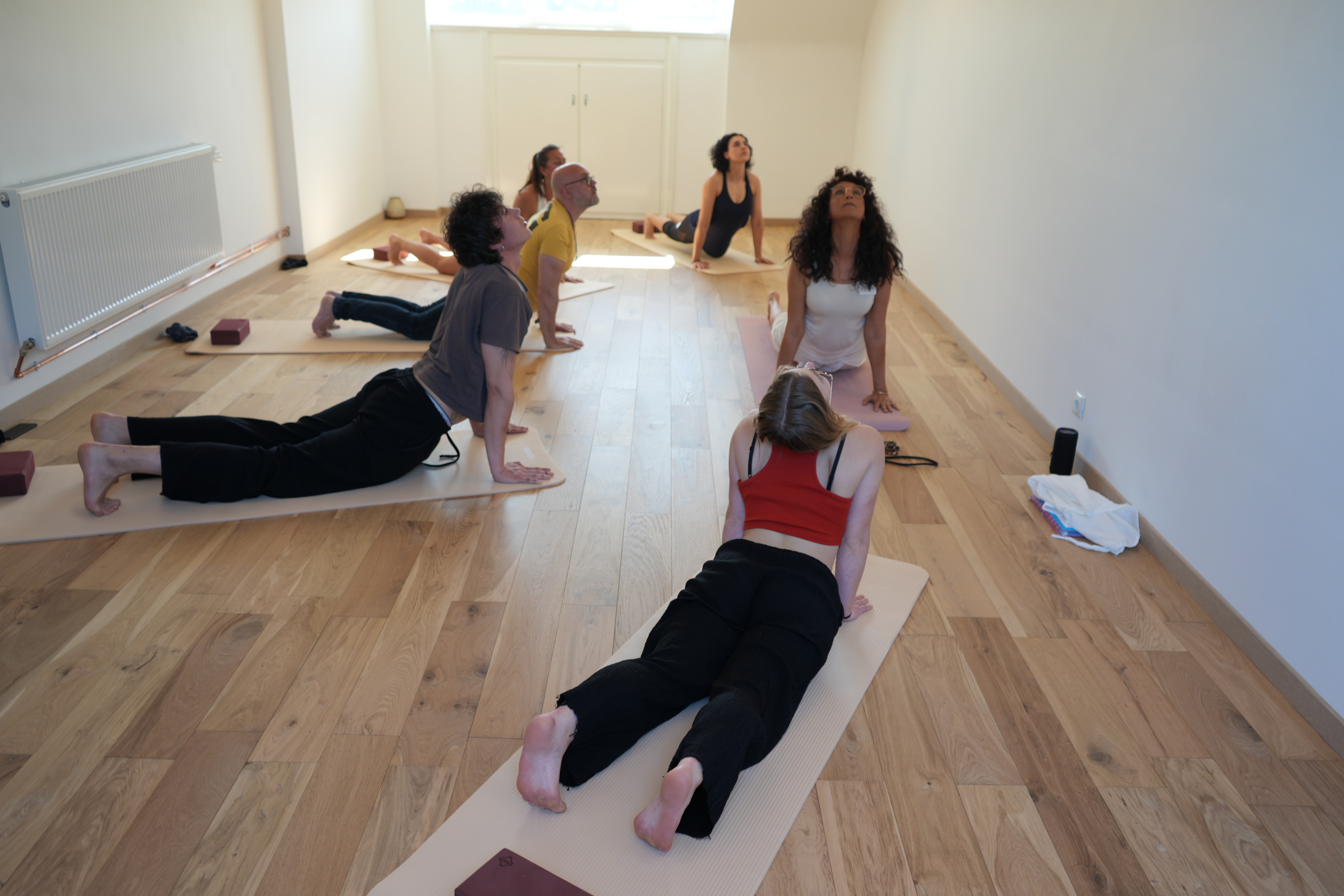 Cette séquence dynamique est plus intensive. Pranayama (Art du Souffle) et Asana (posture) évoluent et se terminent par « Savasana » posture couchée pour débuter une courte session de relaxation.
